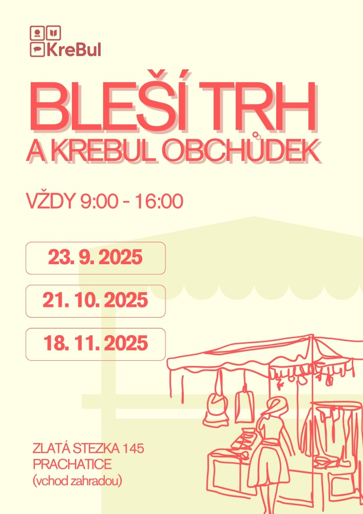 Další z prodejních dní - Bleší trh a KreBul obchůdek - je připraven na úterý 23. září (další pak 21. října a 18. listopadu). V čase od 9:00 do 16:00 hodin můžete vybírat a zakoupit ze zboží, které máme v nabídce a dát tak věcem druhý život. Těšíme se na ...